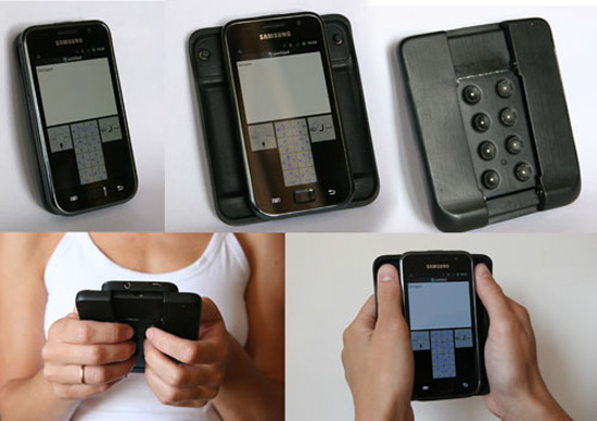 Клавиатура выглядит как чехол, в который «облачается» мобильное устройство. Затем легким движением руки чехол превращается в элегантные шорты раздвижную клавиатуру с восемью четырехпозиционными джойстиками, расположенными в два ряда на задней стороне панели. В данном случае печатать – значит управлять джойстиками, при этом на экране отображается таблица, где указаны символы, соответствующие позициям джойстиков.