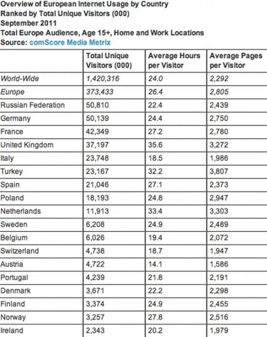 Аналитики из компании ComScore опубликовала подсчеты интернет-пользователей из всех стран Европы за сентябрь 2011 года. И что бы вы думали: Россия заняла в рейтинге первое место. Нас на пространствах Всемирной Паутины около 50,8 миллиона (и это только пользователи старше 15 лет). Прежним лидером была Германия, 50,1 миллион жителей которой используют Сеть.