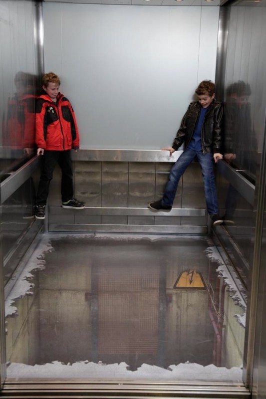 На самом деле это трехмерная оптическая иллюзия, созданная художником Эндрю Уокером (Andrew Walker). Это очень своеобразная партизанская реклама поездок в Подземелье Немезиды в Alton Towers Resort с 24 марта. Путешествие будет проходить по сети пещер. Впрочем, самым интересным в данным проекте остается реакция людей, которые заходят в лифт и обнаруживают пустоту под своими ногами.