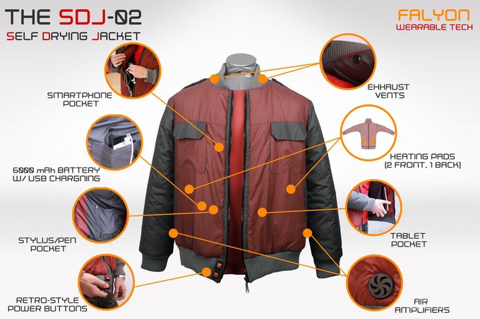 По мотивам культовой трилогии «Назад в будущее» были созданы самошнурующиеся кроссовки, ховерборды и даже летающие машины. Стартап Falyon Wearable Tech представил вторую версию красно-серой куртки МакФлая, которая получила название SDJ-02. Она получила массу функций из кинофильма и являет собой усовершенствованную версию модели SDJ-01, выпущенной в 2015 году.