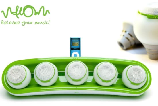 В комплект системы flOw входит не только док-станция, к которой подключается плеер, но и набор из пяти беспроводных динамиков. Колонки, покрытые силиконовым слоем, предназначены не только для воспроизведения музыки, но и для управления самим плеером.