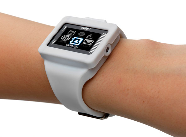 Технические характеристики устройства просты и незамысловаты: 1,46-дюймовый сенсорный дисплей с маленьким стилусом, гарнитурой и картой на 2 гигабайта в комплекте, медиаплеер, FM-радио и календарь. Часы sWaP Rebel выпускаются в зеленом, белом, оранжевом, розовом или черном цвете, их габариты составляют 205×45,5×17,52 мм, они весят 65 г, а аккумулятора емкостью 240 мАч хватает на 160 минут в режиме разговора или 85 часов в режиме ожидания. А на одном из концов силиконового ремешка притаился USB-разъем, чтобы обмен данными с компьютером был максимально простым. Стоимость sWaP Rebel составляет 300 американских долларов.