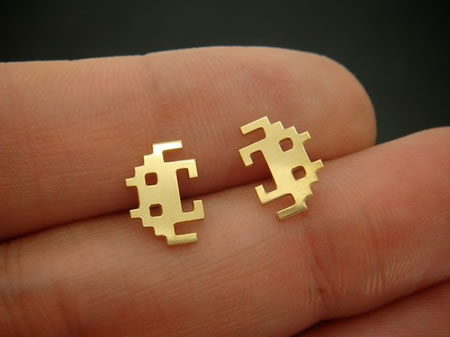 Внимание, всем любителям чудаковатой моды! Хотите ярко выделяться в толпе? Тогда вам нужны оригинальные детали, маленькие, но изящные. Например, запонки или сережки. Смотрели «Выход через сувенирную лавку» об истории мирового стрит-арта? Даже если и нет, то наверняка играли в восьмибитные игры. И данный персонаж – Космический Захватчик (он же Space Invader) – вам известен не понаслышке. Он постоянно вдохновляет дизайнеров на все более безумные задумки.