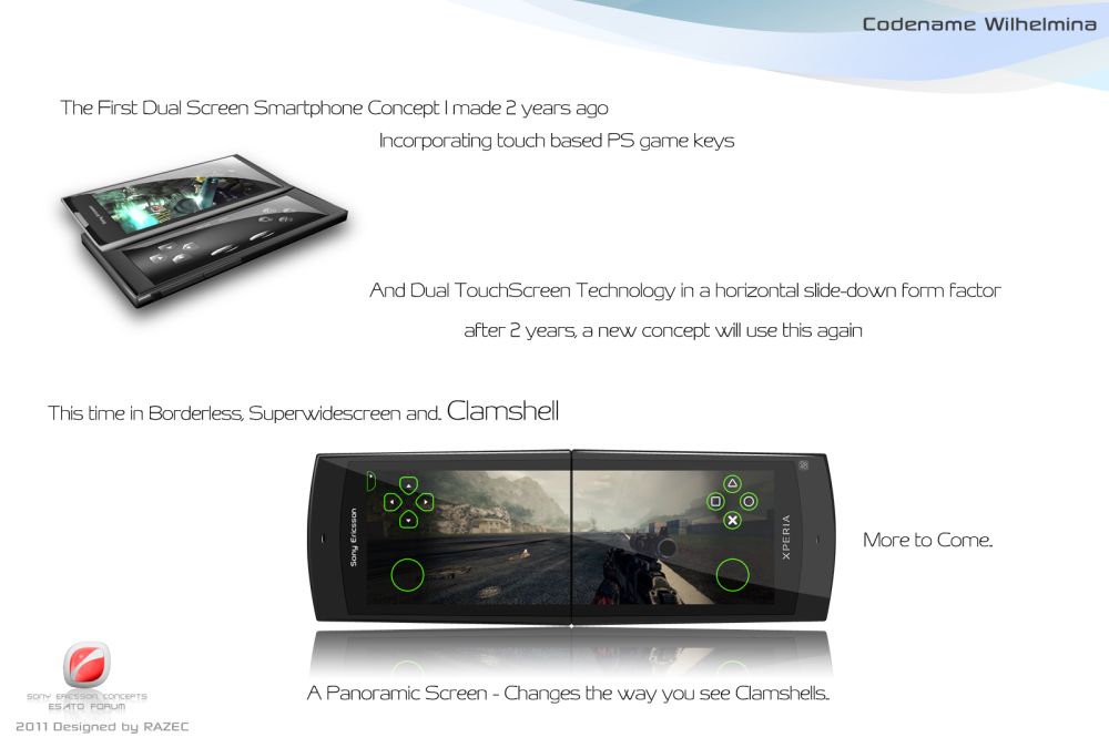 Именно это устройство взял за основу автор концепта игрового смартфона Sony Ericsson Xperia Wilhelmina. Это устройство тоже оснащено четырехъядерным процессором, обеспечивающим высокую производительность особенно в графических задачах. А вот внешний вид смартфона сильно отличается от портативной консоли нового поколения, смартфон выполнен в раскладном форм-факторе, на половинках корпуса расположены сенсорные дисплеи, которые в разложенном виде становятся одним большим экраном, на который выводятся и элементы управления, физических кнопок здесь нет.