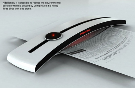 Группа дизайнеров (Hosung Jung, Junsang Kim, Seungin Lee и Yonggu Do) создала концепт нового принтера, который печатает без чернил и работает на солнечной энергии. Только представьте: больше никаких заправок картриджей, пятен чернил на бумаге и пальцах, проводов, путающихся под ногами! Как же работает это волшебный аппарат? Принцип печати солнечного принтера сходен с выжиганием по дереву с помощью увеличительного стекла.