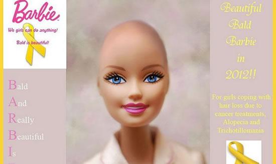 Компания-производитель Mattel решила сделать лысую куклу после того, как благотворительная онлайн-акция на Facebook собрала больше 150000 лайков. Идея оказалась весьма удачной. Кукла уже сейчас готова к реализации с полным набором париков, шляп, шарфов и аксессуаров. Правда, несмотря на похожесть, производители пока классифицируют лысую куклу как «приятельницу» настоящей Барби. Они предполагают, что эта задумка станет коммерчески успешной, ведь лысая кукла совмещает традиционную игру в моду и совершенно особенные примерки париков и шляп.