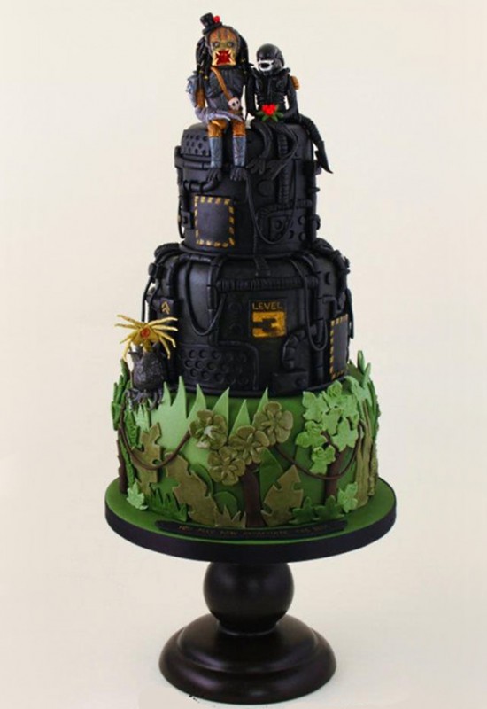 Little Cherry Cake Company занимается созданием настоящих произведений кулинарного искусства – многоярусных свадебных тортов. Но помимо классических белоснежных сладостей с фигурками молодых на вершине компания производит торты и для тех из влюбленных пар, кого можно со стопроцентной уверенностью назвать гиками и ударенными на всю голову. Взять хотя бы этот пример – торт с классическими героями фильма «Чужой против Хищника». Ярусы выполнены в тематическом стиле, а в основании торта можно увидеть надпись: «Теперь Вы можете обезглавить невесту». Да, не перевелись еще настоящие романтики с чувством юмора. Компания по производству свадебных тортов предлагает ни в чем себе не отказывать и создать тематический торт из любой придуманной Вселенной, включая недавно вышедшего «Прометея». Конечно, самое главное при выборе такого свадебного торта не попасть впросак и не остаться без невесты вовсе.