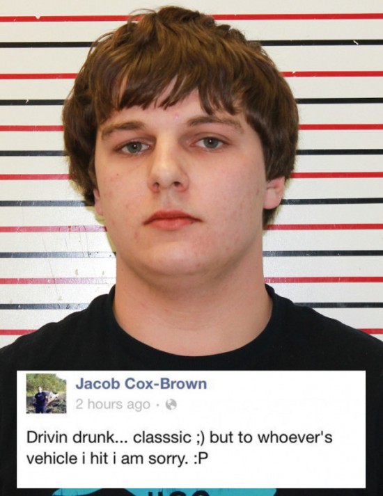 Естественно, как заведено в США, это не осталось без внимания доброжелателей Джейкоба: кто-то уже через день отправил анонимку со скриншотом статуса в полицию. Вся эта история учит нас не только тому, что езда в пьяном виде — это плохо и противозаконно, но также и тому, что нужно быть осмотрительнее в выборе друзей в социальных сетях.