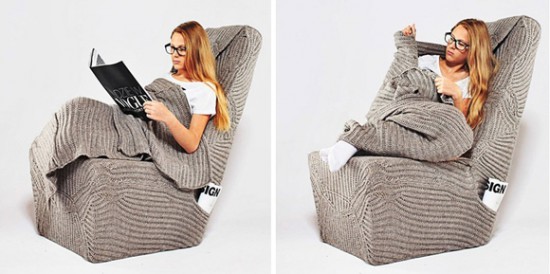Женщина-дизайнер Ага Бжостек (Aga Brzostek) со всем присущим женским чутьем к созданию и охране домашнего очага создала очень интересный проект. Она назвала его Креслом для Осени и Зимы. В самом деле, для этих промозглых и холодных времен года столь оригинальный предмет мебели подойдет прекраснейшим образом. Весь секрет в том, что он выглядит, как свитер крупной вязки из теплой и мягкой шерсти. И к нему в комплект прилагается плед из той же ткани, чтобы согреть человека, решившего провести вечер в компании этого кресла, почитать интересную книгу или просто подремать под шум дождя. Плед отстегивается от кресла, что позволяет его стирать или просто заменять на другой, который больше соответствует вашим представлениям об уюте. С таким креслом вам будет уютно в любую погоду.