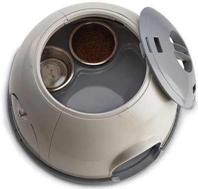 В таком случае следует обратить внимание на кормушку PetSafe Feeding Station. Кормушка в форме купола надежно закроет всю пищу внутри. Собака не сможет залезть туда просто из-за своих больших габаритов. Теперь не будет никаких сражений за еду, а только тишина и умиротворение в доме. Кормушка содержит две миски, для воды и пищи, и имеет два выхода – сверху и сбоку. Через верхнюю дверь удобнее всего ставить кошке корм.