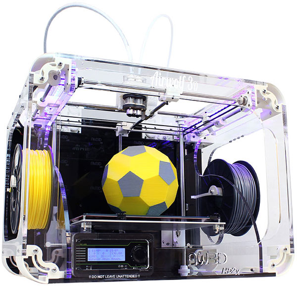 В список используемых для печати материалов входит нейлон и даже поликарбонат, но при печати одновременно из двух разных материалов нужно учитывать их совместимость. Габариты области печати равны 28х20х30 сантиметров. Минимальная толщина слоя при печати – 0,06 миллиметра, а точность позиционирования головки равна 0,02 миллиметра. Airwolf 3D HD2x – это довольно быстрый принтер: его скорость составляет 150 миллиметров в секунду. Плюс к этому, его не нужно подключать к ПК – он позволяет подгружать 3D-модели непосредственно в его память. Цена вопроса – 4000 долларов США.