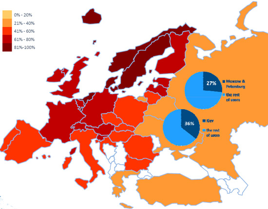 По информации исследовательской компании AC&M-Consulting, в России уже каждая четвёртая семья обеспечена широкополосным доступом в Интернет. Интернет-доступ на скорости не менее одного мегабита в секунду имеют 25,5% квартир, это на полтора процента больше, чем на Украине и на полпроцента меньше, чем в Турции. Мировыми лидерами по этому показателю в первом полугодии 2010 года остались Южная Корея (88%), Нидерланды (81%) и Дания (77%).