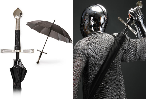 Broadsword Handle Umbrella – это самый крутой в мире зонтик. Он имеет ручку средневекового меча и когда торчит за вашей спиной – то и выглядит точно как меч. Кто из нас не мечтал в детстве помахать мечом, как рыцарь? Теперь у нас есть уникальная возможность в минуты опасности выхватить этот зонтик и защитить прекрасную даму от страшной угрозы промокнуть в дождь.