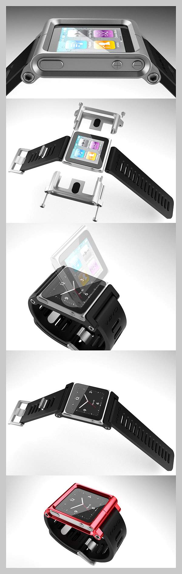 Этот дизайнер является автором разработки очень стильных наручных часов TikTok и LinaTik, представленных на этой большой фотографий. Отличий во внешнем виде у этих моделей нет никаких, что, в принципе, заметно. На самом деле, это не просто наручные часы, это весьма и весьма полезный гаджет, который наверняка придется по душе владельцам медиаплеера Apple iPod nano последнего поколения. Творения Скотта Уилсона имеют съемную основную часть, то есть позволяют отделать сами часы, корпус которых выполнен из высококачественного и крепкого сплава алюминия, от удобного ремешка, исполненного из кремнийорганического каучука. На место циферблата устанавливается… да, верно, плеер iPod nano, снабженный мультисенсорным экраном и множеством различных функций.