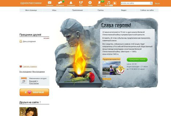 22 июня 1941 года – один из самых страшных дней в новейшей истории нашей страны и в то же время один из самых памятных. Российская социальная сеть «Одноклассники» решила провести благотворительную акцию, которую приурочила к 70-летию начала Великой Отечественной войны. Акции «Слава героям» стартовала 21 июня и закончится сегодня вечером.