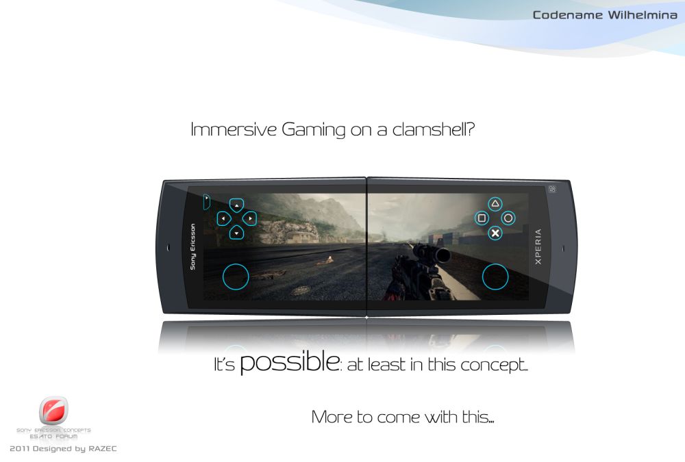 Именно это устройство взял за основу автор концепта игрового смартфона Sony Ericsson Xperia Wilhelmina. Это устройство тоже оснащено четырехъядерным процессором, обеспечивающим высокую производительность особенно в графических задачах. А вот внешний вид смартфона сильно отличается от портативной консоли нового поколения, смартфон выполнен в раскладном форм-факторе, на половинках корпуса расположены сенсорные дисплеи, которые в разложенном виде становятся одним большим экраном, на который выводятся и элементы управления, физических кнопок здесь нет.