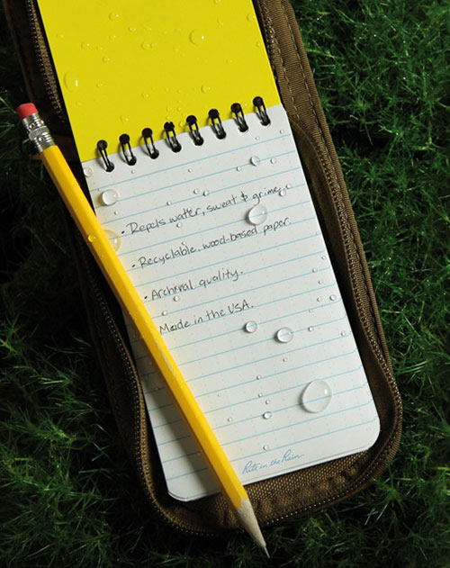 Ничего, и на этот случай есть решение. Специальная водонепроницаемая записная книжка, которая выдержит любые погодные условия. Стоит это чудо вражеской американской техники 5.93 $. Весь секрет заключается в особенной бумаге, пропитанной специальным составом.