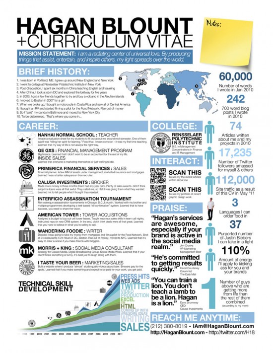 Не так давно появилась новая мода — при приеме на работу не ограничиваться простым перечислением достижений на белых листах формата А4. Все началось с того, что некий Хаган Блаут (Hagan Blaut) искал работу и составил вот такое информативное и неформальное резюме. Он выложил его в Facebook и Twitter и попросил всех друзей разослать резюме во все места, где оно могло бы заинтересовать потенциальных работодателей. За месяц в результате ретвитов и перепостов резюме собрало более 100 тысяч просмотров. Таким образом, на Хагана свалилось большое количество предложений о работе. Его история стала знаковой в мире финансов и менеджмента. Теперь он занимается тем, что помогает создавать людям необычные резюме, которые на 100% «выстрелят». И таких историй с креативными резюме сейчас немало. Предлагаем вашему вниманию самые яркие работы.