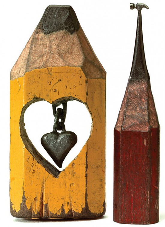 Далтон умудряется вытачивать из обычных пишущих инструментов, которыми мы с вами пользуемся ежедневно, подвижные пластичные шедевры: звенья цепей, буквы алфавита, крошечные молоточки и отверточки и многое-многое другое. И все это на кончике карандашного грифеля. У мастера отличное чувство вкуса и золотые руки. Его работы – настоящий «пир» для глаз. Интересно рассматривать каждую работу, находить новые детали и думать о том, сколько труда затратил Далтон на эти миниатюрные шедевры. Чрезвычайно живописны и прекрасно вписываются в композицию и сами карандаши.