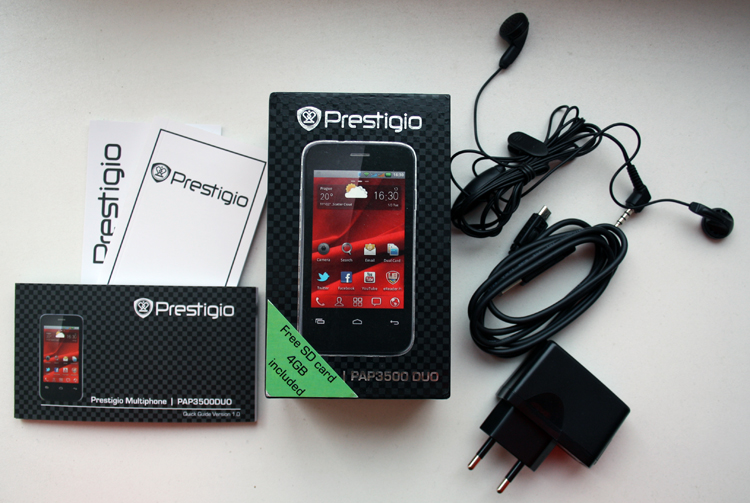 В стандартную комплектацию входят качественный чехол, гарнитура, USB-кабель, блок зарядного устройства, 4 Гб flash-памяти и гарантийный талон. Современные смартфоны редко комплектуются чехлами, 4 Гб «флешкой» и гарантией. Гарантия является двухгодичной международной, нежели годичной локальной, как у большинства гаджетов, продаваемых на отечественном рынке. Prestigio MultiPhone 3500 Duo — компактный смартфон под управлением ОС Android 2.3, оснащенный 1 ГГц процессором и поддержкой двух SIM -карт.
