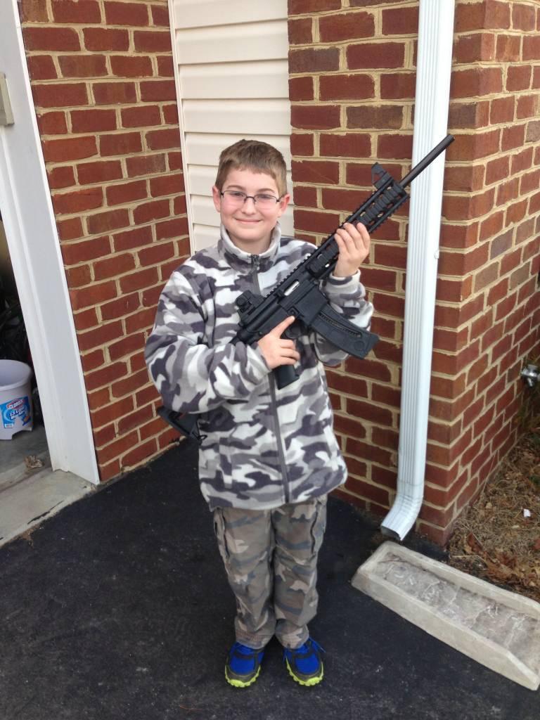 На самом деле это не боевое оружие, а уменьшенная копия калибра 5,6 мм. Впрочем, непрофессиональным взглядом разглядеть эту деталь на фотографии не получается, поэтому вышеупомянутые бдительные граждане позвонили «куда следует», и в дом к мальчику и его отцу начали приезжать представители властей, включая социальных работников и полицейских. Как заявил Шон Мур (Shawn Moore), он подарил винтовку сыну только для того, чтобы ездить на охоту.