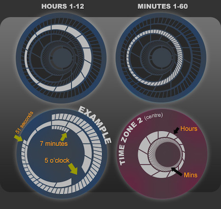 На дисплее есть шесть спиралей, которые похожи на воронку торнадо. Кольцо, самое дальнее от центра, демонстрирует секунды, а внутренние спирали подразумевают часы и минуты. Первые и вторые внутренние спирали показывают часы с 1 до 12 и 60 минут, а внутри них снова часы 1-12 и 60-минутные отметки. После того, как стал понятен смысл, время тяжело не разглядеть. Чтобы установить время и дату, проведите пальцем по экрану слева направо, дабы разблокировать, и затем регулируйте настройки. Kisai Vortex имеют корпус из нержавеющей стали с линзой из минерального стекла, крышка открывается на пружине, как и в классических часах. Стоимость часов Kisai Vortex – 149 долларов, и доступны они в двух вариантах: с синим LCD-экраном и синей подсветкой, и с естественным экраном и красной подсветкой.