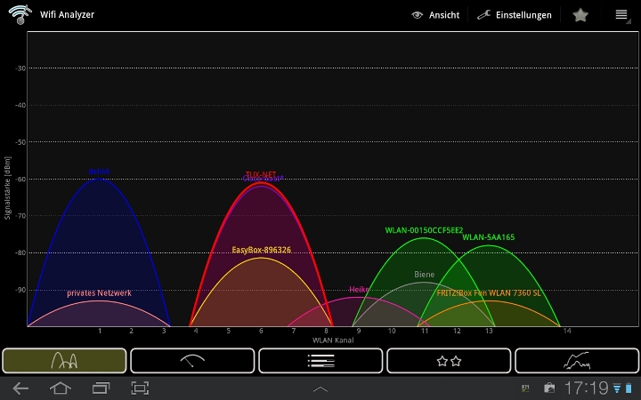 В-третьих, можно обратиться к специальным приложениям. Аналогом описанных выше программ для определения свободного канала служит Wi-Fi Analyzer, разработанный для Android OS. Его функционал позволяет определить лучшую область приема сигнала.