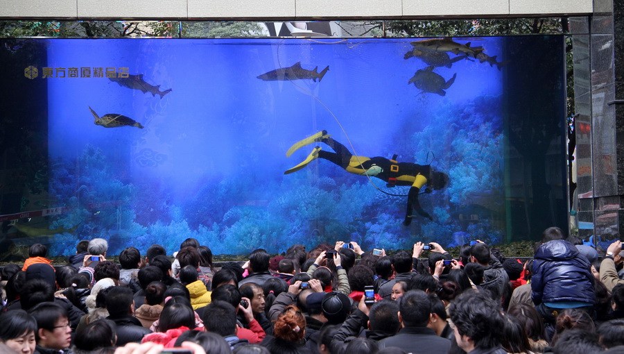 Наверное, многим было интересное, каким должно быть стекло в огромных аквариумах, чтобы оно выдерживало давление воды? Очевидно, некто в китайском торговом центре не задумывался об этом вопросе вообще, потому что гигантское фронтальное стекло большого аквариума разлетелось, покрыв посетителей 33 тоннами воды, крошевом стекла, ну и акулами в придачу.