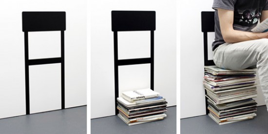 Стул Stack Chair, «нарисованный» на стене – довольно нестандартная дизайнерская идея. Состоит стул из двух частей – виниловой наклейки на стену и кипы книг или газет, положенной рядом с наклейкой. Как видно из иллюстрации, получается вполне «работоспособный» стул – сидеть на нём можно.