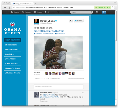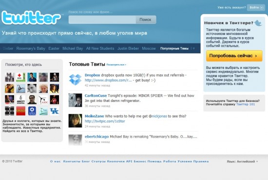 Российская компания «Яндекс» обнародовала результаты исследования русскоязычного сегмента блог-хостинга Twitter «Цифры и факты про Твиттер». «Яндекс» подсчитал, что русскоязычных аккаунтов в социальной сети уже больше миллиона (общее число аккаунтов почти 200 миллионов). Среди них 6,4 процента тех, кто оставляет сообщения на своих страницах каждый день.