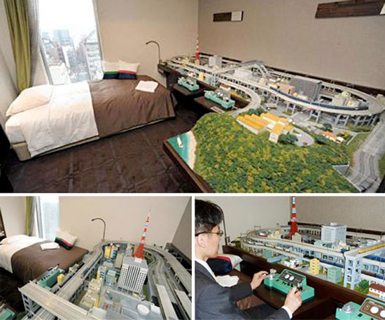 Как известно, японские поезда — самые поездатые быстрые поезда в мире. Ну а то, что японцы любят все свои достижения возводить в культ, давно известно. В общем, в Японии много, очень много фанатов поездов и миниатюрных железных дорог. Это настолько распространённое хобби, что один из токийских отелей начал предлагать постояльцам снимать тематический номер, половину которого занимает игрушечная железная дорога.